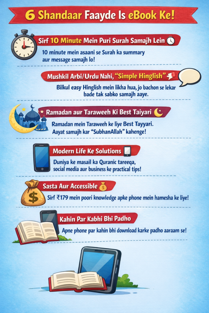 “Busy life ke liye Best Solution!” “Job ke saath moti Tafseer ki kitabein padhna bohot mushkil tha. DeepStep ki is eBook ne meri mushkil aasaan kar di. Sirf 10 minute mein Surah ka context aur message samajh aa jata hai. Ab office aate-jaate waqt main ek nayi Surah samajh leta hoon. ₹179 mein yeh knowledge free ke barabar hai!” (Verified Purchase)